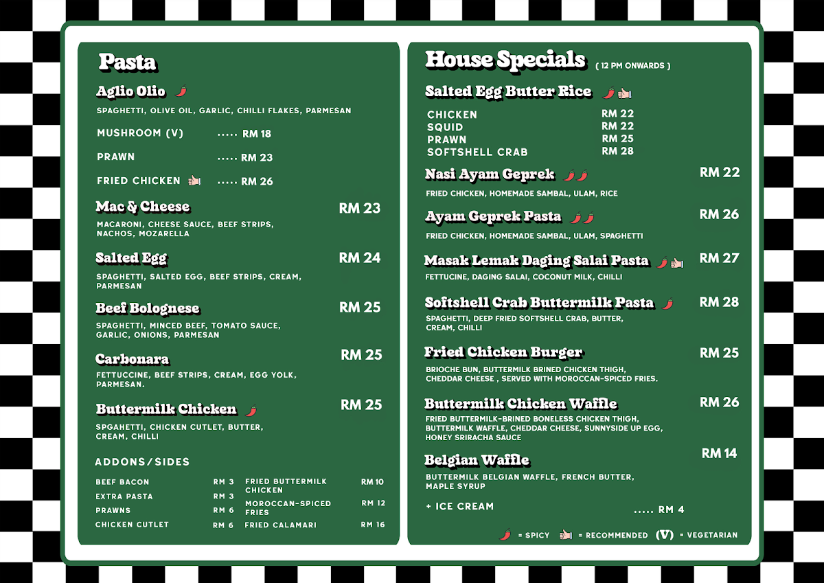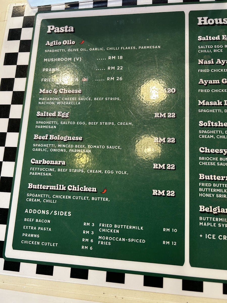 The menu at Oregano Cafe @ Tabuan Tranquility 3 offers a variety of food and beverage options primarily centered around pasta dishes, with additional rice selections and an assortment of desserts. The food selection includes several pasta specialties such as Salted Egg Pasta, Prawn Aglio Olio, Carbonara, and variations featuring soft shell crab. There are also comfort food items like Mac and Cheese and Buttermilk Chicken Waffle. For dessert, the menu features items such as French Seasalt Brownie, Red Velvet Cake, and a range of cookies including Matcha Ganache and Red Velvet variants.