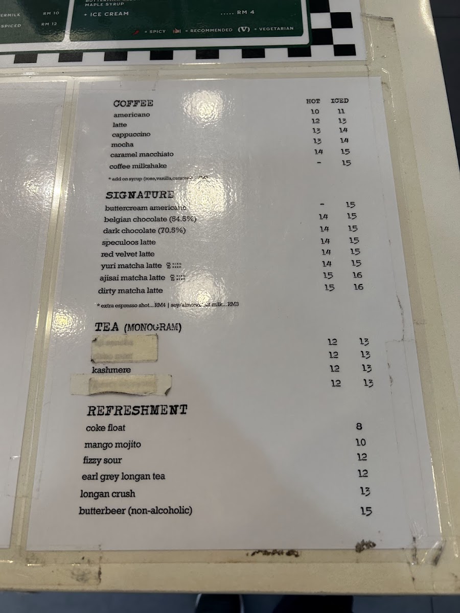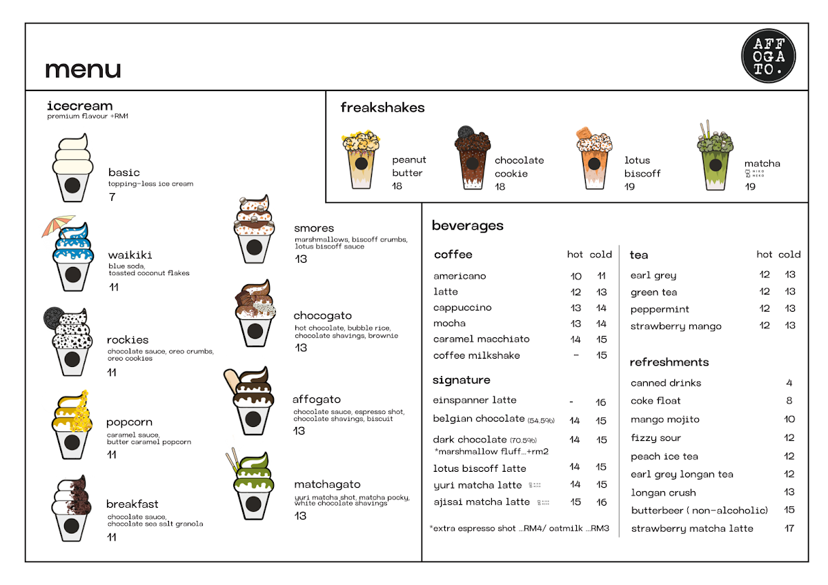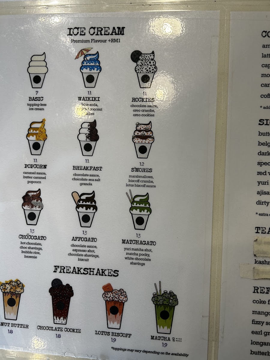 On the drinks side, offerings include various coffee preparations like Latte and Coffee Smoothie, as well as teas and specialty iced beverages such as Iced Dark Chocolate and Thai Milk Tea Ice Cream with Chocolate Crispies.
